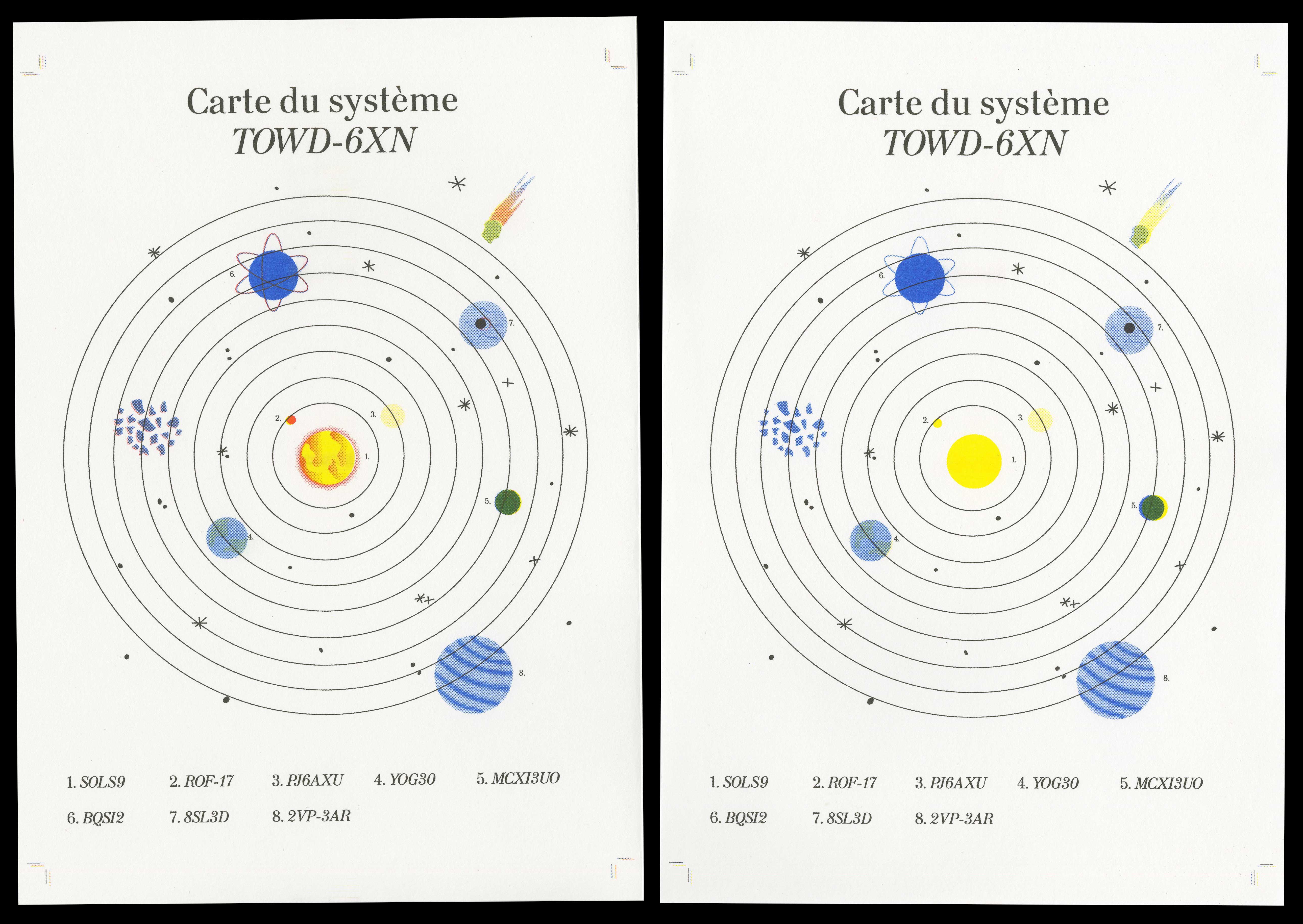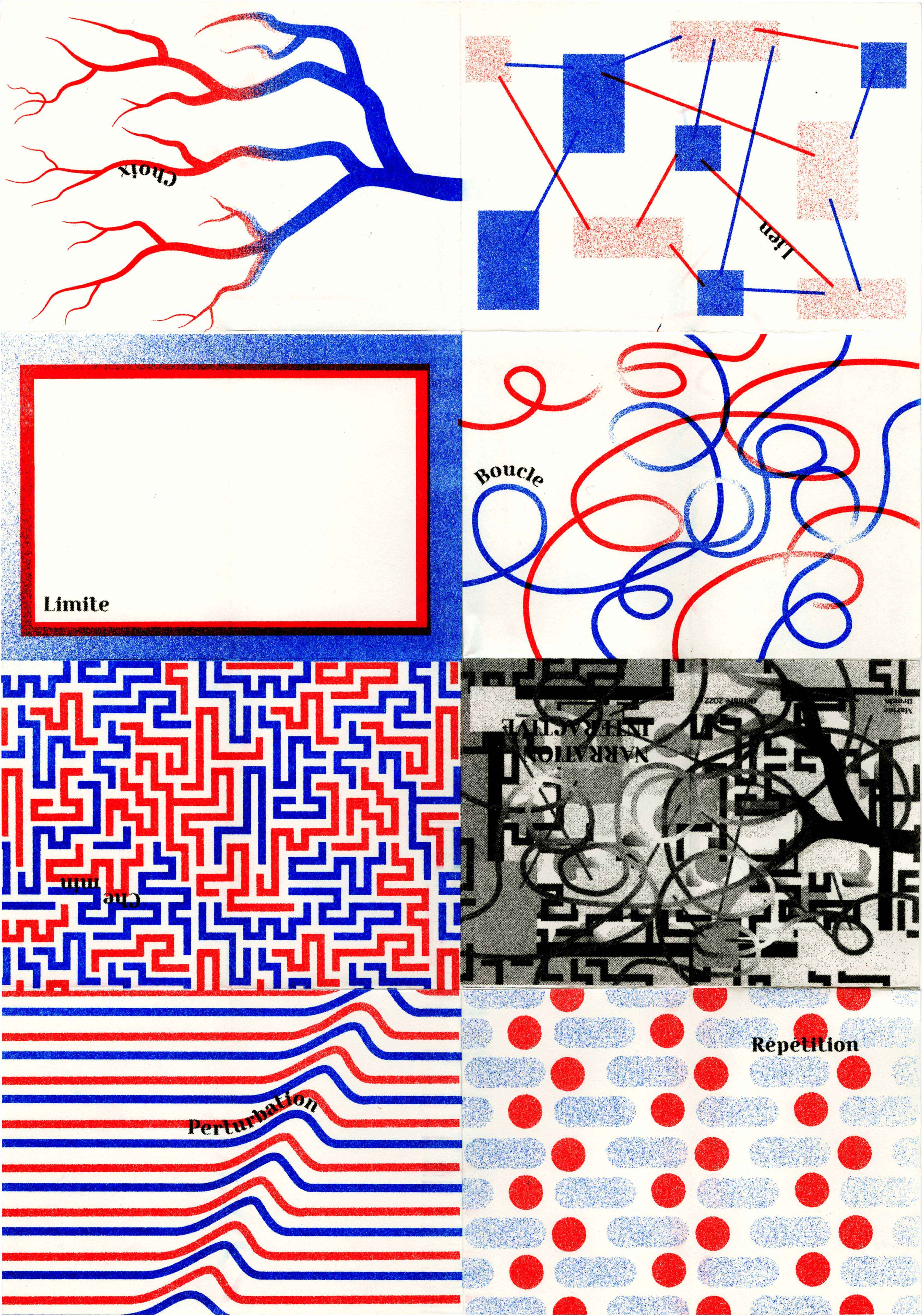 J’ai produit un livret de mots-clés autour de mon sujet de mémoire afin de le définir par des mots et des formes dans le but de le comprendre. L’édition a été imprimée en A3 et en riso avec 3 couleurs.