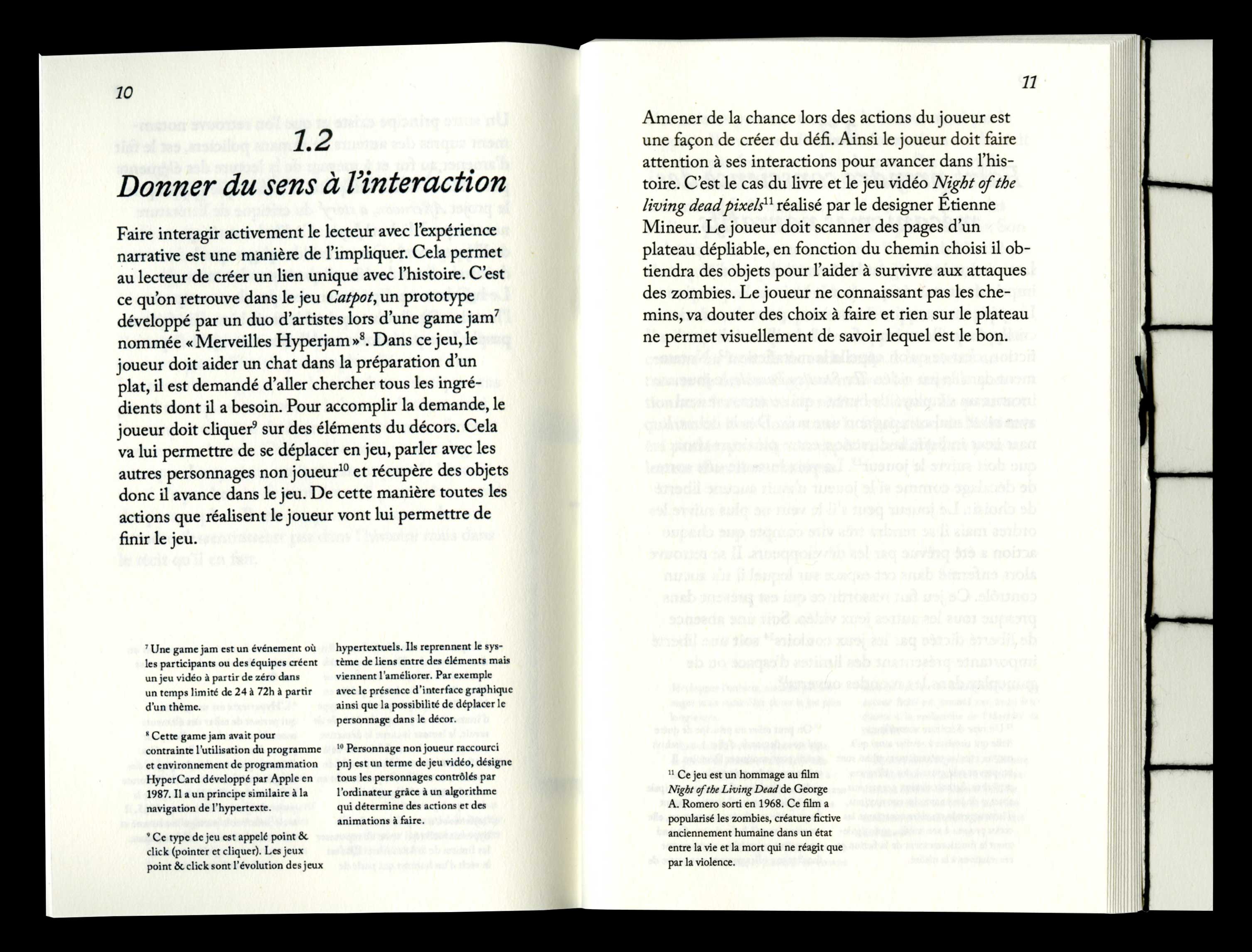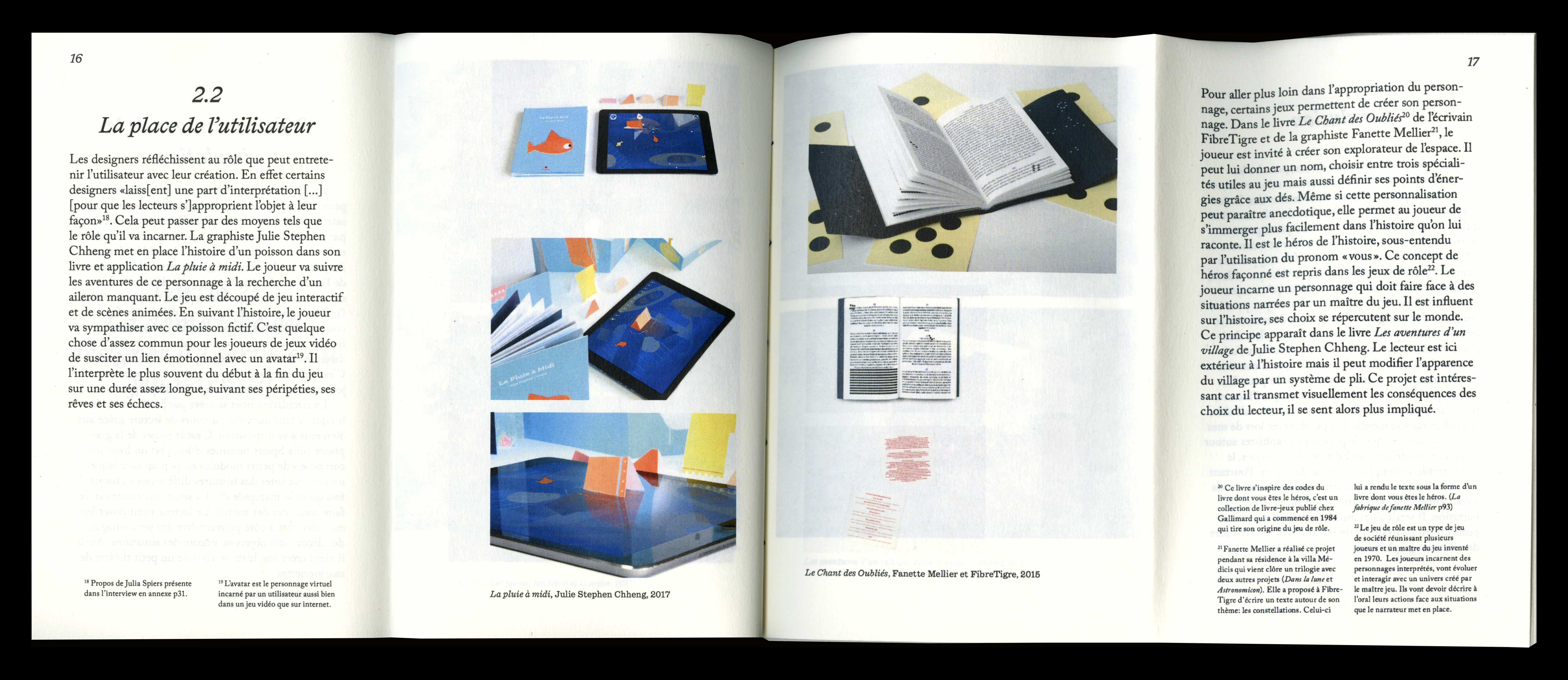 Ce mémoire explore la manière dont le jeu peut transformer le récit et comment cela influe sur la manière de concevoir des expériences narratives. J’étudie des projets imprimés, numériques ou hybrides qui apportent différentes solutions pour raconter une histoire. Je m’intéresse aussi à la démarche du designer qui s’amuse avec les normes pour créer un jeu narratif.